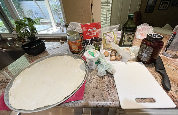 Pizza dough. We buy ours from a local Italian deli, Claros, and it makes the best pizzas. If you don’t have an Italian deli in your area, Trader Joe’s has good pizza dough. And if you don’t have a Trader Joe’s nearby, you’re on your own. Don’t give up; pizza dough is not always easy to find. But look around for it. Don’t go with prepared pizza crusts; your pizza won’t be nearly as good.