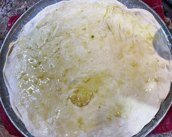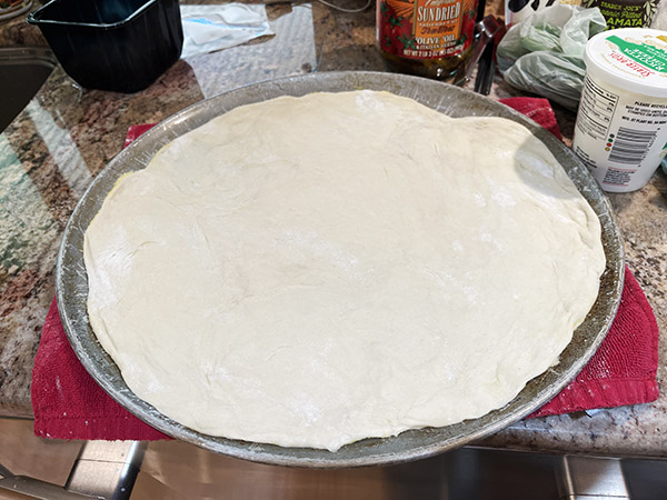 Flatten and spread the pizza dough on a large pizza pan. I like a thin crust, so we make it as thin as we can. It’s probably about 1/8-inch after we do this.