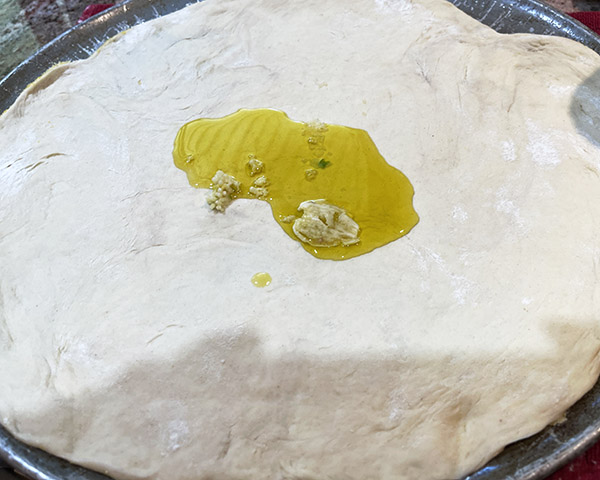 Pour a puddle of olive oil onto the pizza dough so that it forms about a 4-inch circle.