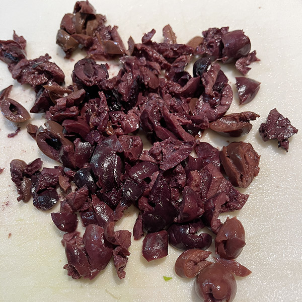 Kalamata olives. Some people like to use black olives instead of Kalamata olives. There’s no accounting for some people’s tastes, I guess.