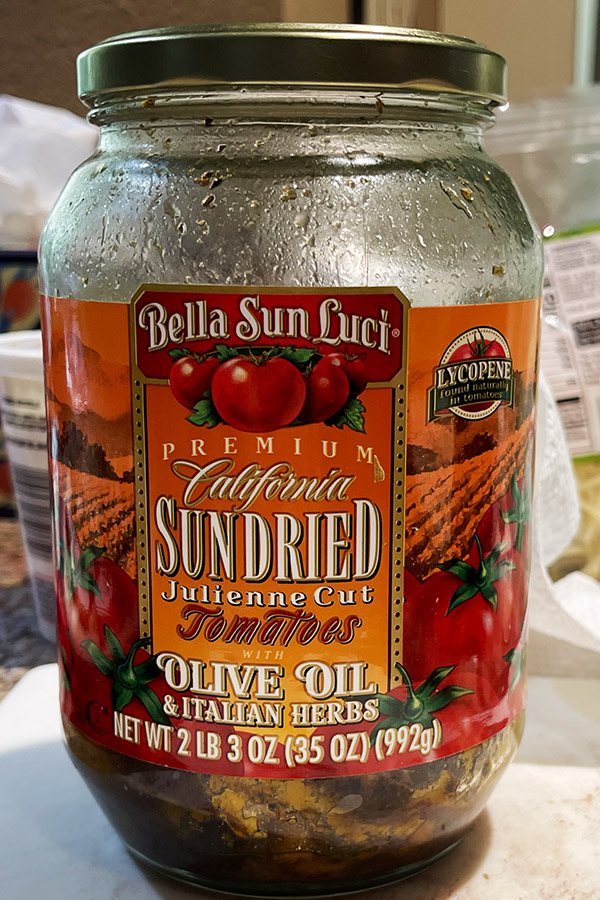 Sun-dried tomatoes. Get the kind that are bottled in oil; don’t get the dried kind. We prefer the sun-dried sold by Costco, but our local Costco doesn’t always have them.