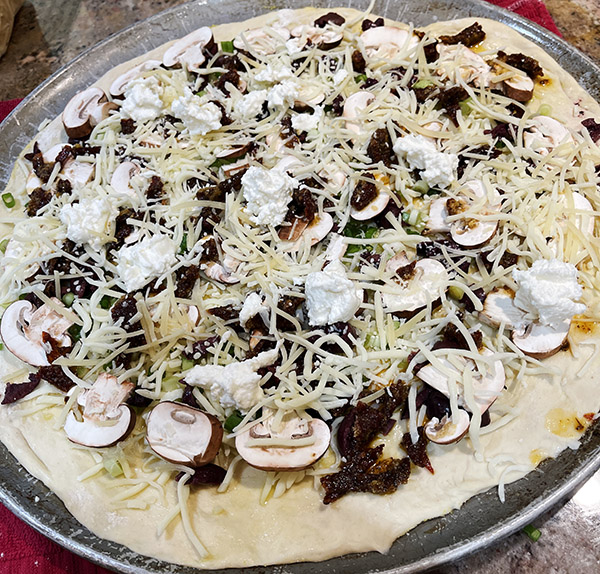Sprinkle about 15 or 20 pieces of sun-dried tomatoes on the pizza.