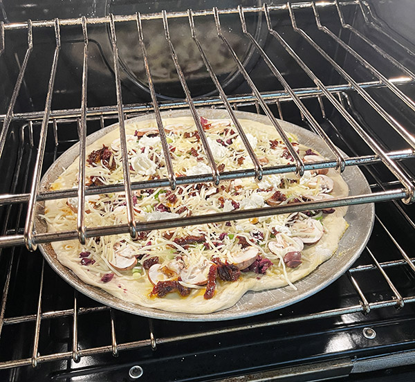 Place the pizza in the preheated oven. In our oven, it seems to heat more evenly with the pizza on the bottom rack.