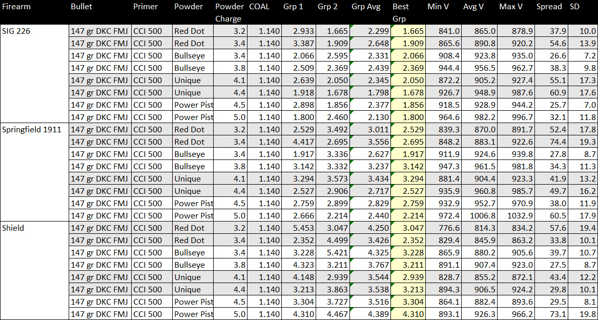 I fired my 9mm DKC bullet handloads at the West End Gun Club using the 147-grain full metal jacket bullets. I tested the bullets in three different handguns (a Springfield 1911, a SIG P226, and a S&W Shield), with a light load and a heavier load for each of four different propellants (Red Dot, Bullseye, Unique, and Power Pistol). For the initial accuracy testing, I shot two 5-shot groups at 50 feet for each configuration.