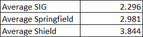 I averaged all groups for each handgun (both high and low loads and the different propellant loads). Predictably, the SIG returned the best groups overall, and the short-barreled Shield was the worst. The SIG has always been a stellar performer.