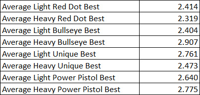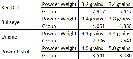 I then considered the results across the three pistols to try to select a powder that I could use for all three handguns. To do this, I averaged the three pistol’s performance with the light Red Dot load, the average performance with the heavy Red Dot load, etc. Nothing emerged as a significantly better accuracy load, as you can see below.