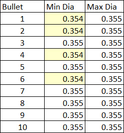 That had me wondering about bullet diameter. After zeroing my calipers, I measured the diameter of 10 bullets. Note that these are stated by the supplier to be 0.355 inches, which is what I would expect on a 9mm jacketed bullet. Here’s what I found: