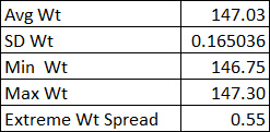 That first bullet was right on the money at 147.0 grains, so I thought these would prove to be good bullets from a weight variability perspective. But I was wrong, as the remaining measurements above showed. Here are the particulars on weight variability: