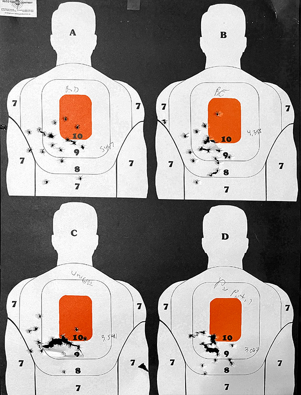 The targets you see above are (clockwise from top left), the heavier Red Dot load, the heavier Bullseye load, the heavier Unique load, and the heavier Power Pistol load. If you eliminate the one or two flyers in each group, there’s not a lot of difference between any of the heavier loads.