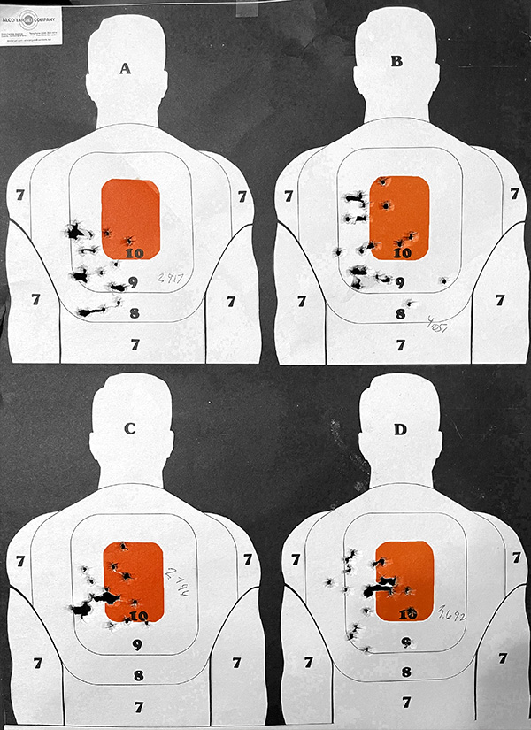 I also had 20 rounds left for each of the four loads at the lower end of the propellant charges. I took these 80 rounds and one of the Alco mini-4 silhouette targets to my indoor range. I again fired all rounds through the SIG, shooting the groups you see below at 10 yards. Here’s what that target looked like: