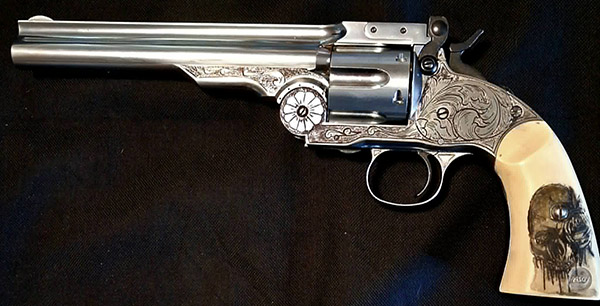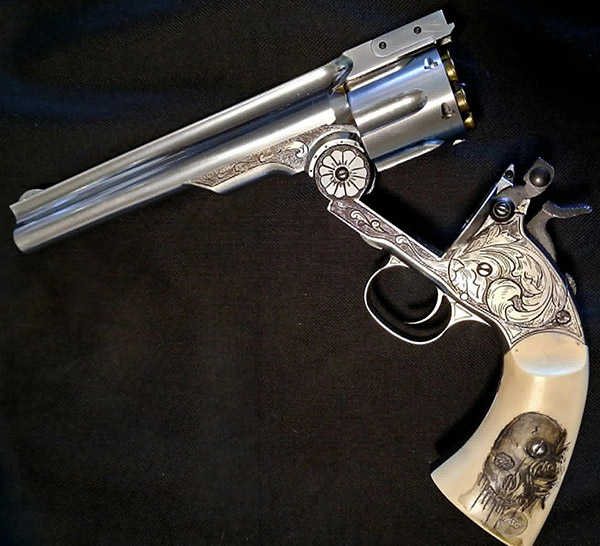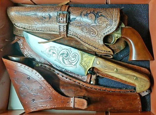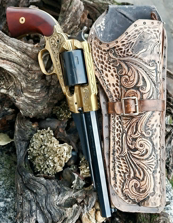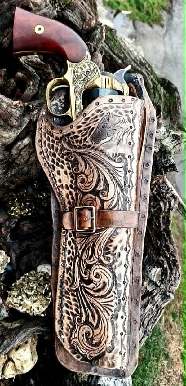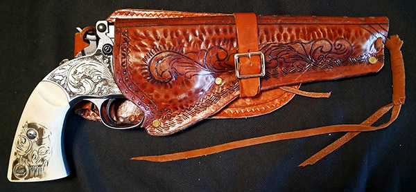 I’m a passionate engraver. I’ve been engraving for 15 years.  I’m experienced in various engraving techniques.  I also work with leather, which allows me to make sheaths for both the guns I engrave and the knives.  With engraving, I do what inspires me…I don’t have any established subjects.