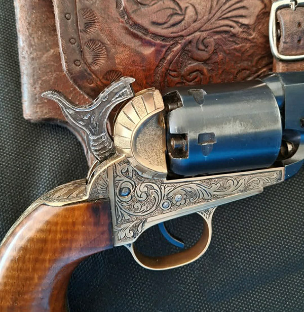 Last week, a fellow named Aldo Venturini posted some intriguing pictures of cap and ball revolvers he had engraved, along with a few knives he had made.  One thing led to another, and with the help from Translate.Google.com we had an interesting conversation.   Here’s what Aldo told me: