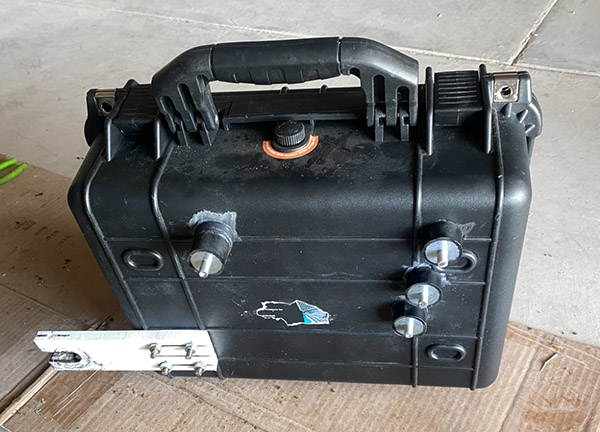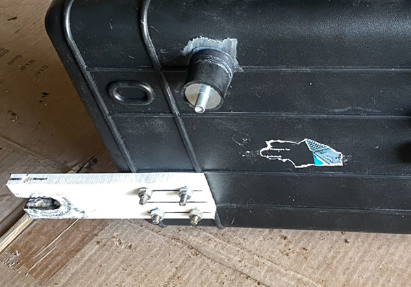 My favorite store, Harbor Freight, had a sale on pelican-style plastic cases. Branded Apache, they are fairly sturdy, weather tight boxes that even have a pressure relief valve for those high altitude runs. Normally these cases are used for cameras, test equipment or anything that needs protection from the bumps and bruises of life in these United States.  The HF cases look like most of the bags attached to popular Adventure Barges except a bit smaller. I bought two of the 3800 series for $50 total. Attaching them to the Buell was a challenge.  Being an underslung monoshock frame there’s not a lot of bolts on the back section to attach things to. One obvious spot is the passenger peg. It’s a big, strong bolt that you could lift the bike from. The first step was to make a bit of plastic (brand name: Starboard) to connect the bag to the footpeg. This gave me a starting point to work out the rest of the mounting system.
