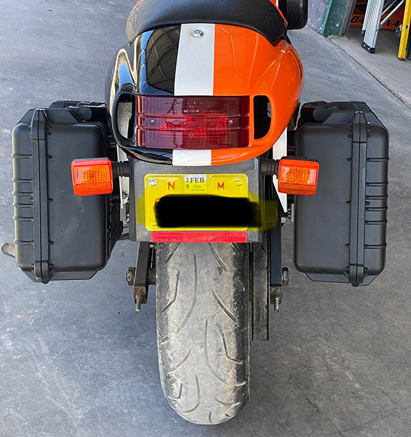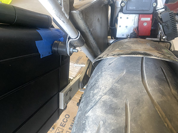 I need to do a little work on the shock absorber (two steps back), but the bags turned out well. (One step forward) at speed I reached back to touch them, and they were mostly vibration-free. The rear bracket is not my finest hour and if these bags hold up, I may take a stab at a better-looking rear bracket.