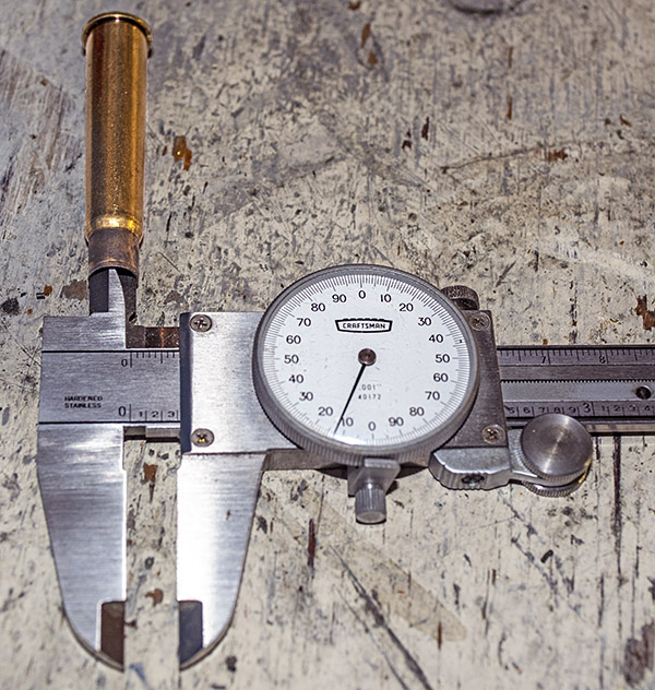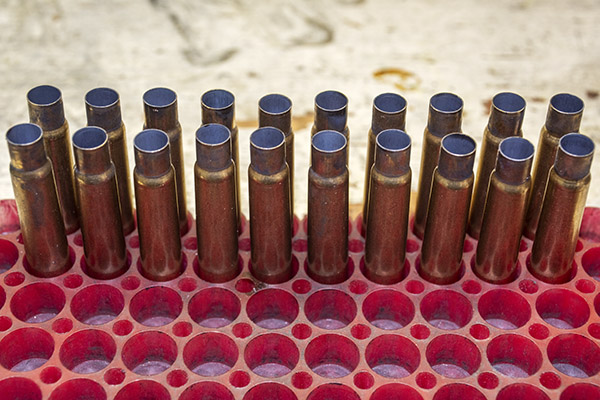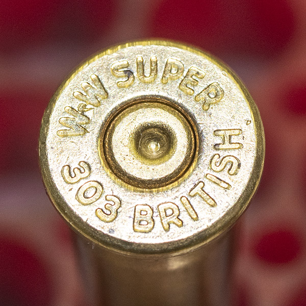 Once-fired .303 British cartridge cases. They almost look like scaled-down .375 H&H cases.A close-up view of the .303 British case after firing. These cartridge cases are ready for the reloading process.The headstamp. These are Winchester cases. Note the spent and indented primer, which will be removed in the case resizing process.