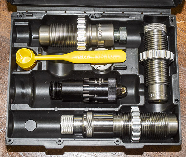 The Lee Ultimate 4-die set includes two resizing dies (a full-length resizing die, and a collet die for neck sizing only), a bullet seating die (that also includes a roll crimping feature), and a separate crimping die for applying what Lee calls a factory crimp. The die set also includes a shell holder (a nice touch, as other manufacturer’s die sets do not) and a powder scoop. I’ve never used the powder scoop; I use a more precise powder dispenser.