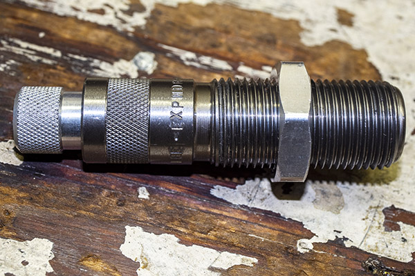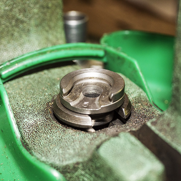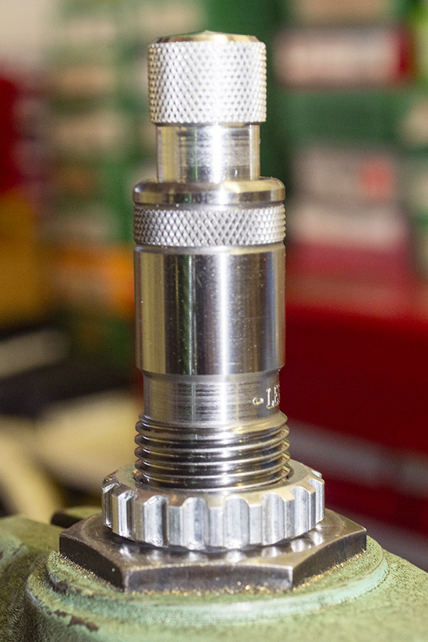 It was time to turn to the Lee Ultimate 4-Die set’s bulleting seating die. The first step was to install the bullet seating die in the press and screw it partially in.
