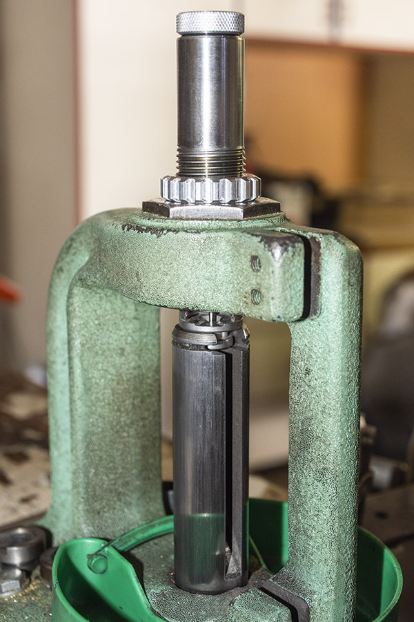 I lubed each case with the lube Lee provided and ran it through the full-length resizing die, which simultaneously brought the cases back to factory dimensions and removed each case’s spent primer. The full-length resizing dies does both steps in one operation.