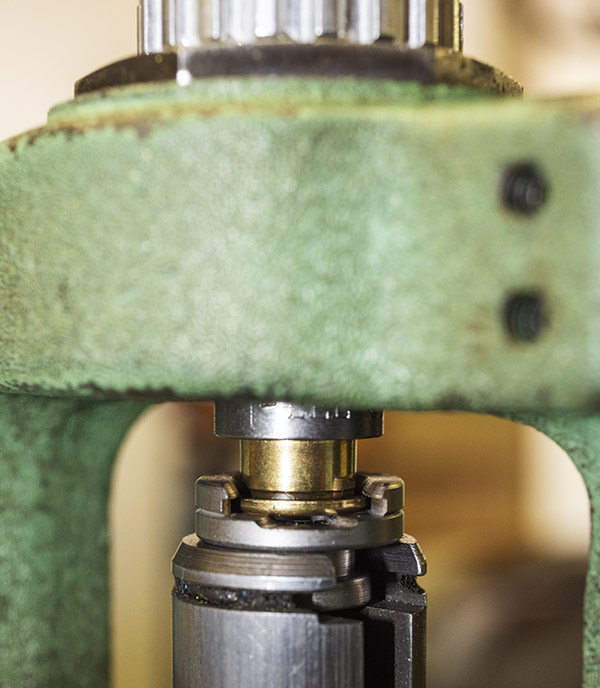 A 9mm case in the turret press.Raising the ram to resize the case and push the spend primer out (the decapping operation).When the ram is lowered, the turret is cammed a quarter turn counterclockwise.
