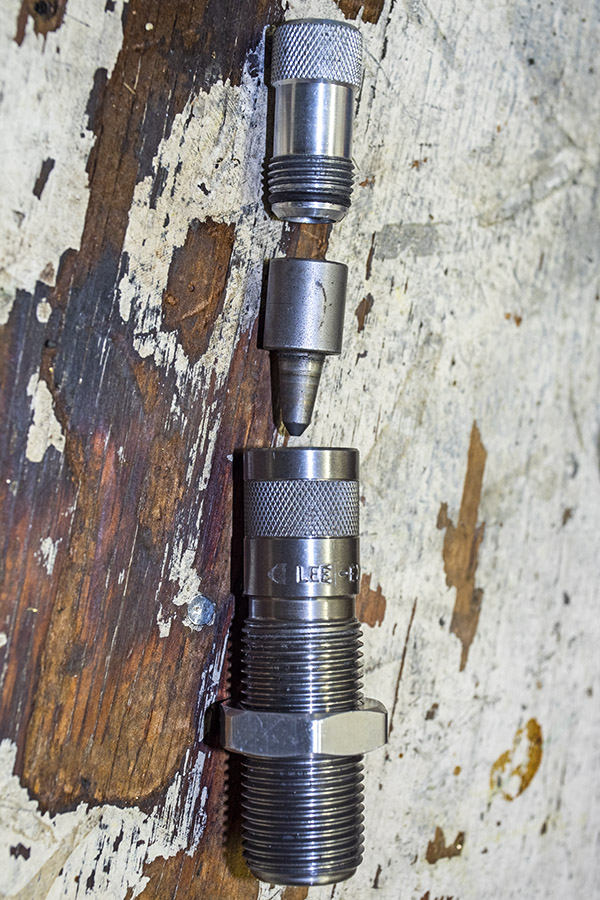 The dies are cartridge specific. For handgun cartridges, the die set usually includes three dies; for rifle cartridges, the die set usually includes two dies. The good news is that die threads are pretty much standardized, and every company’s dies will fit every company’s reloading press. In other words, if you buy Lee dies, they’ll work on an RCBS press. If you buy RCBS dies, they’ll work on a Lee press. Dies are offered by several companies, with the most popular brands being Lee and RCBS.