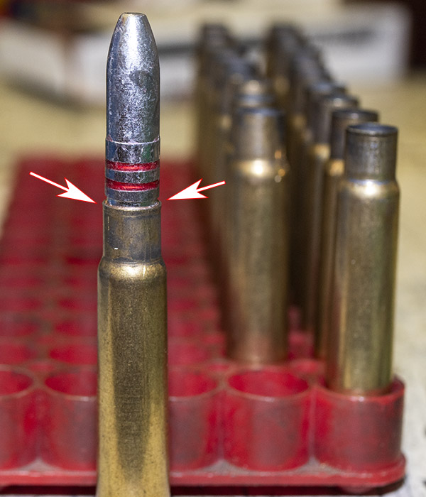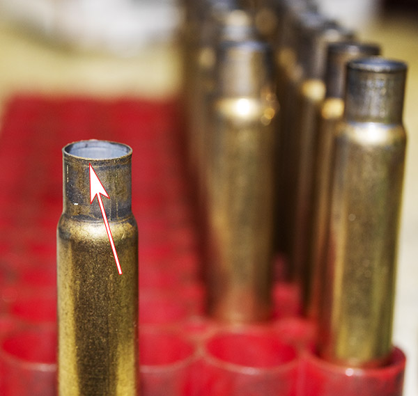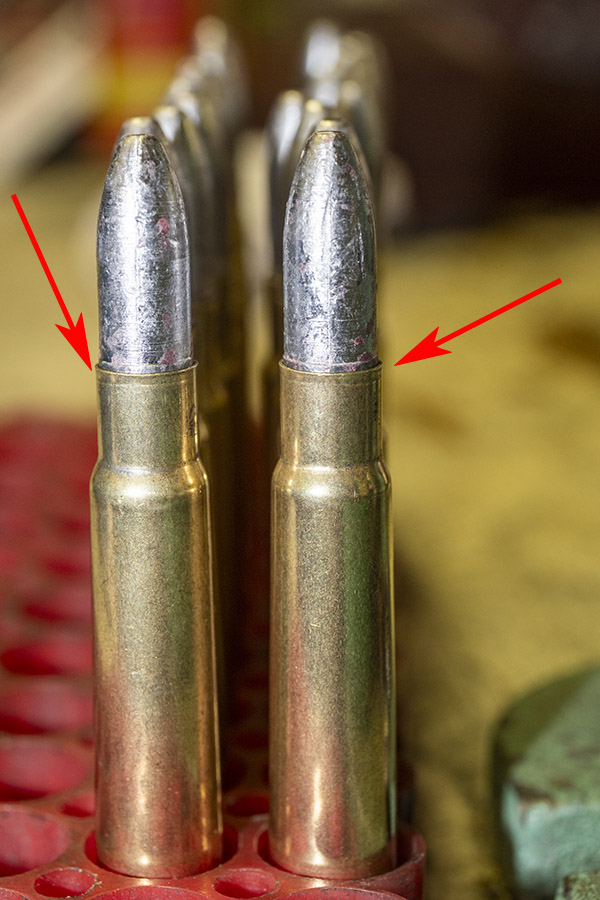 The red arrows point to the remaining flare after seating the bullets. This will be removed with the Lee factory crimp die in the next step.