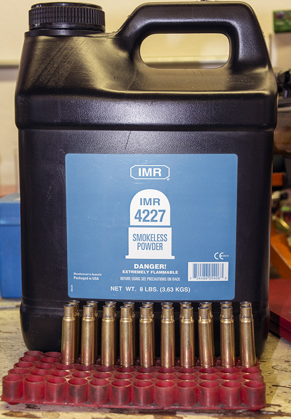 I use an RCBS powder dispenser, and once I had it set up to throw 21.0 grains of IMR 4227 propellant, there was no need to weigh the charge for each cartridge because the powder meters so well. I loaded the 20 rounds like it was pistol ammo, placing each empty brass case beneath the dispenser, charging the case, and moving on. After I had charged all 20 cases, I threw another charge into my scale’s powder cup and weighed it again to make sure the dispenser was still on the money. It was (the powder dispenser released exactly 21.0 grains).