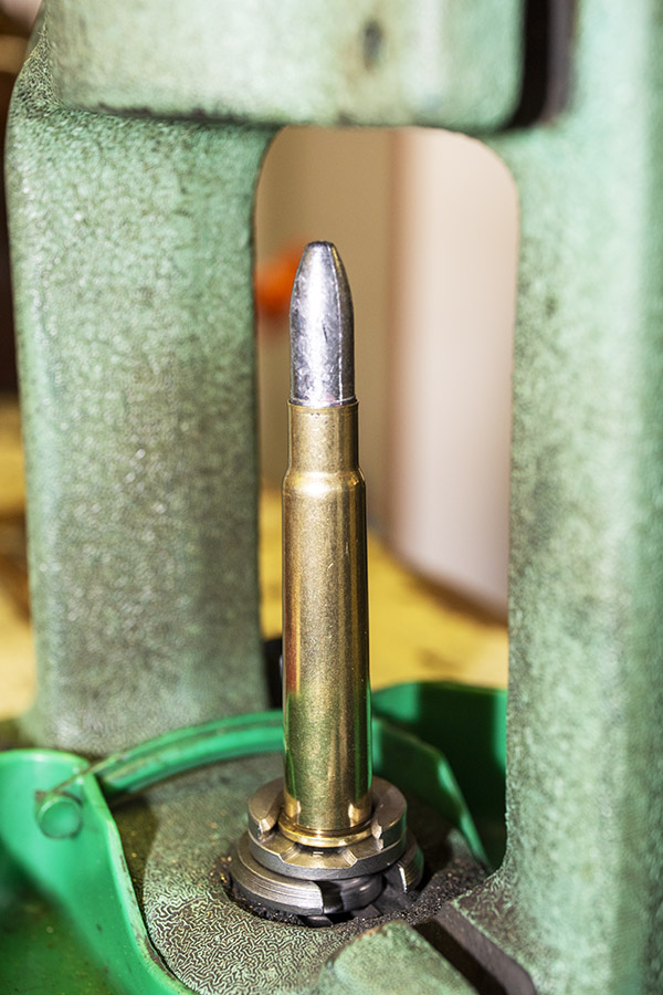 The once-fired brass I had on had was good stuff. It was in the original factory boxes and it was in good shape. Because the rifles it had been fired in previously were not my Enfield, I knew I would have to full length resize the brass first to return each case to factory dimensions. To do that, I mounted the Lee shellholder in my press, ran the press all the way up, and then installed the full-length resizing die, screwing it down in the press until it contacted the shell holder. I then retracted the press ram, turned the die another 1/8 of a turn into the press, and locked the die in place with its locking ring.