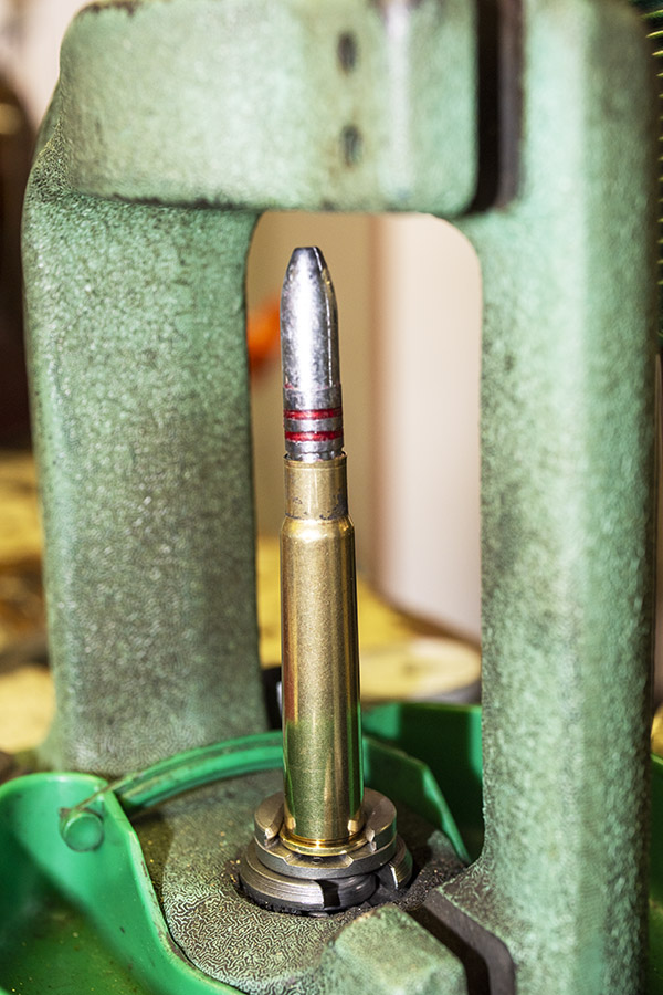 I placed the first bullet over a charged .303 British case (charged with IMR 4227, that is) and raised the ram in the press. Observing where the bullet went (i.e., how deeply it seated in the case), I lowered the die in the press a bit more, repeating the process until I attained the desired bullet seating depth. I wanted the bullets to be seated such that the cartridge mouth was just behind the bullet’s first driving band.