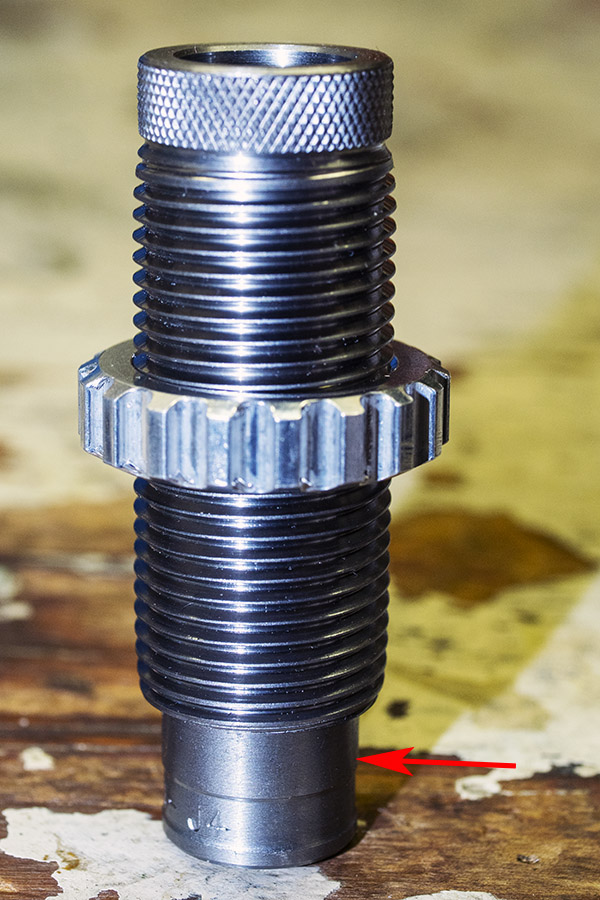 By adjusting how far the die is screwed into the press, you can control how much force is applied to the case mouth. You can screw it in just enough to remove the case mouth flare (as I did), or you can screw it further into the press to apply as firm a crimp as you want around the case mouth.