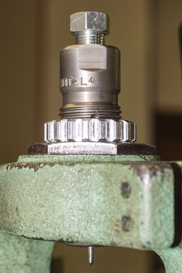 After installing the press handle, you can operate the press to cycle the ram. Each time you do so by raising and the lowering the ram, the turret head will advance a quarter turn (or 90 degrees) counterclockwise. At this point, it’s a good idea to oil the ram, the ram linkage, and the turret. I used gun oil on my press. Lee states in their instructions that any gun oil will do.