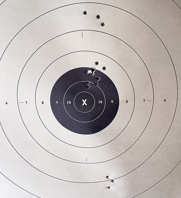 I first shot at the 25-yard target and shot a great group, but it was high (it’s the group circled in red in the target below). The rear sight only had four more clicks left in the down direction, so I dialed those in and fired another five rounds. That produced the group circled in green in the target below. I used a 6:00 hold on the black bullseye for both groups.